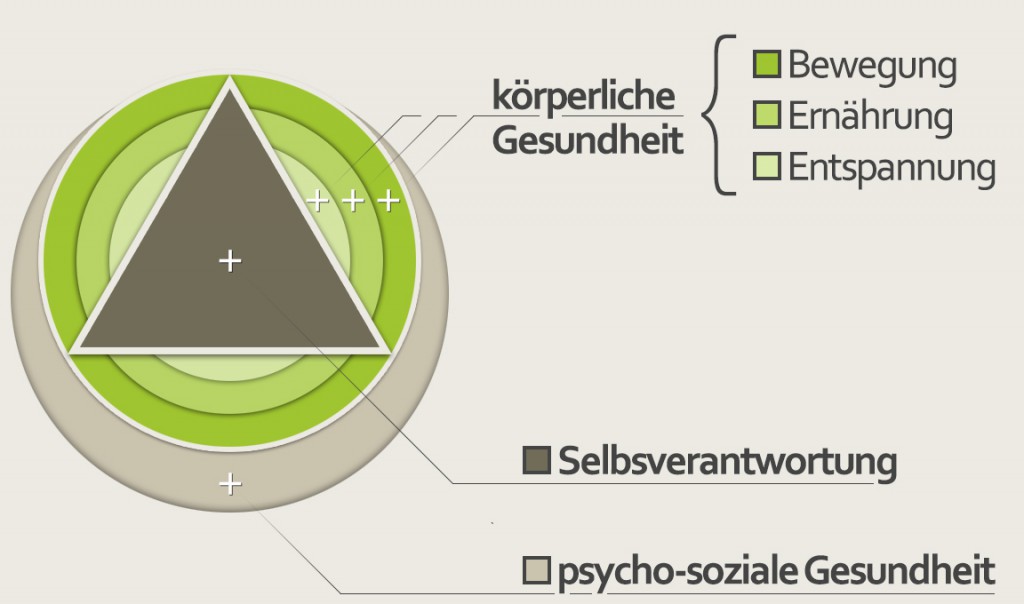 Wie im Schaubild ersichtlich, basiert körperliche Gesundheit neben Ernährung und Bewegung auf Entspannung. Gerade die Fähigkeit entspannen zu können beeinflusst stark die psycho-soziale Gesundheit des Einzelnen, indem sie sich u.a. auswirkt auf die
